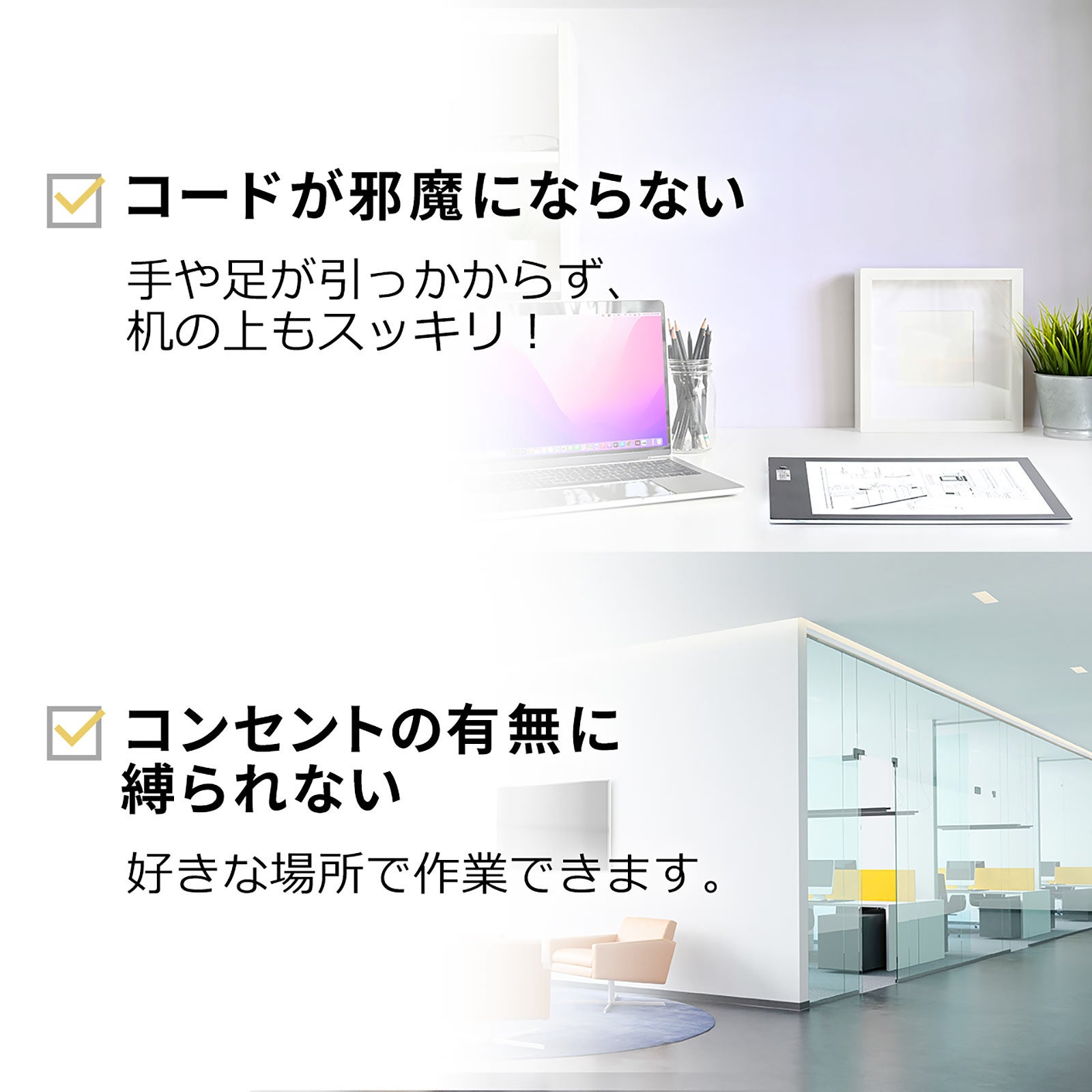 本製品は、使う場所を選ばない充電式トレース台です。充電式タイプの為、コードが邪魔にならず、コンセントの有無にも左右されないケーブルレスタイプです。