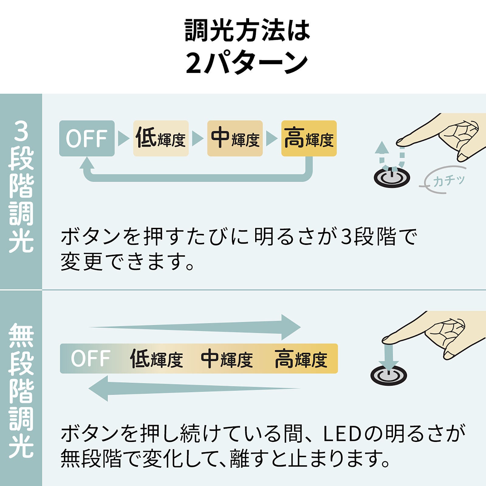 製図やイラスト作成など、下から光をあてて透かして使用します。用途や環境によって、最適な明るさを調整でき、素早く切り替えできる3段階調光、より細かく明るさを調整できる無段階調光の2パターンで調整できます。