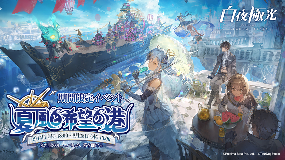 8月4日(木)から新イベント「夏風と希望の港」が開催されます。このイベントは、お出かけにぴったりな夏のある日、主人公、バイス、カレンの3人が気晴らしに港湾都市「ハーバーシティ」を散策することから始まります。最近街へ来たサーカスのショーを楽しんでいたところ、郊外で暗鬼に遭遇してしまいます。観光の傍ら、ハーバーシティに潜む暗鬼の危機を明かしていく主人公たち。そしてサーカス団の団長ジェノとハーバーシティの領主エルビスの間にも、何やら問題があるようで…。