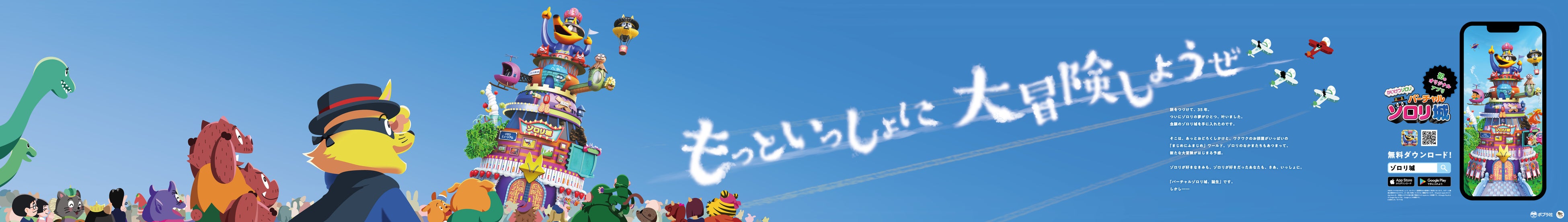 アプリ「かいけつゾロリ バーチャルゾロリ城」の公開を記念して、新宿メトロプロムナードでは8月1日(月)より全長14m超えの巨大ポスターを掲出。ゾロリやイシシ、ノシシのほか歴代のキャラクターたちが完成したゾロリ城を見上げる姿とともに、飛行機雲の「もっといっしょに 大冒険しようぜ」のコピーが描かれている。