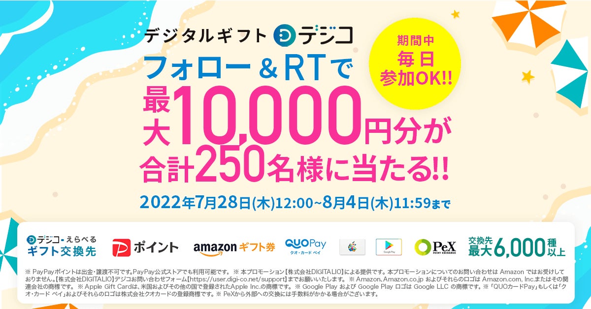 【毎日参加OK!8/4まで】最大1万円分が合計250名様にその場で当たる!デジコ夏休みTwitterキャンペーンを開始