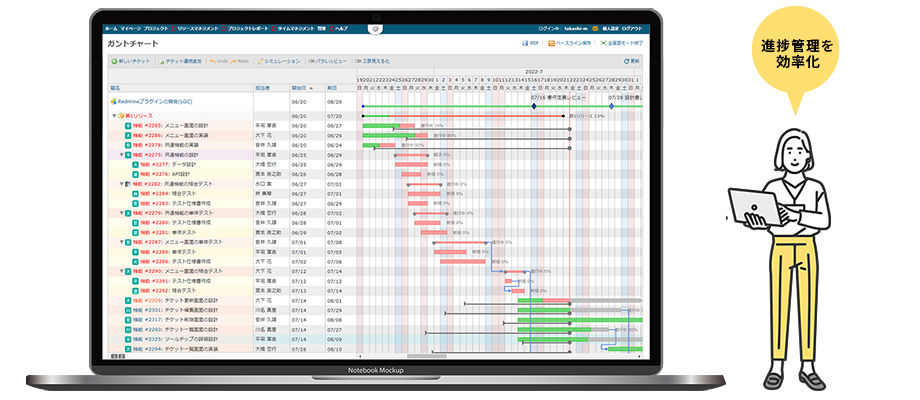 Lychee Redmineはオープンソースソフトウェアで人気のあるRedmineに、進捗管理・スケジュール管理・工数管理などの機能を、目的・用途別に導入を可能とした機能拡張プラグインを提供するプロジェクト管理ツールです。スケジュール管理機能から工数管理、プロジェクトレポート、EVMなど各種プラグイン機能を備えています。