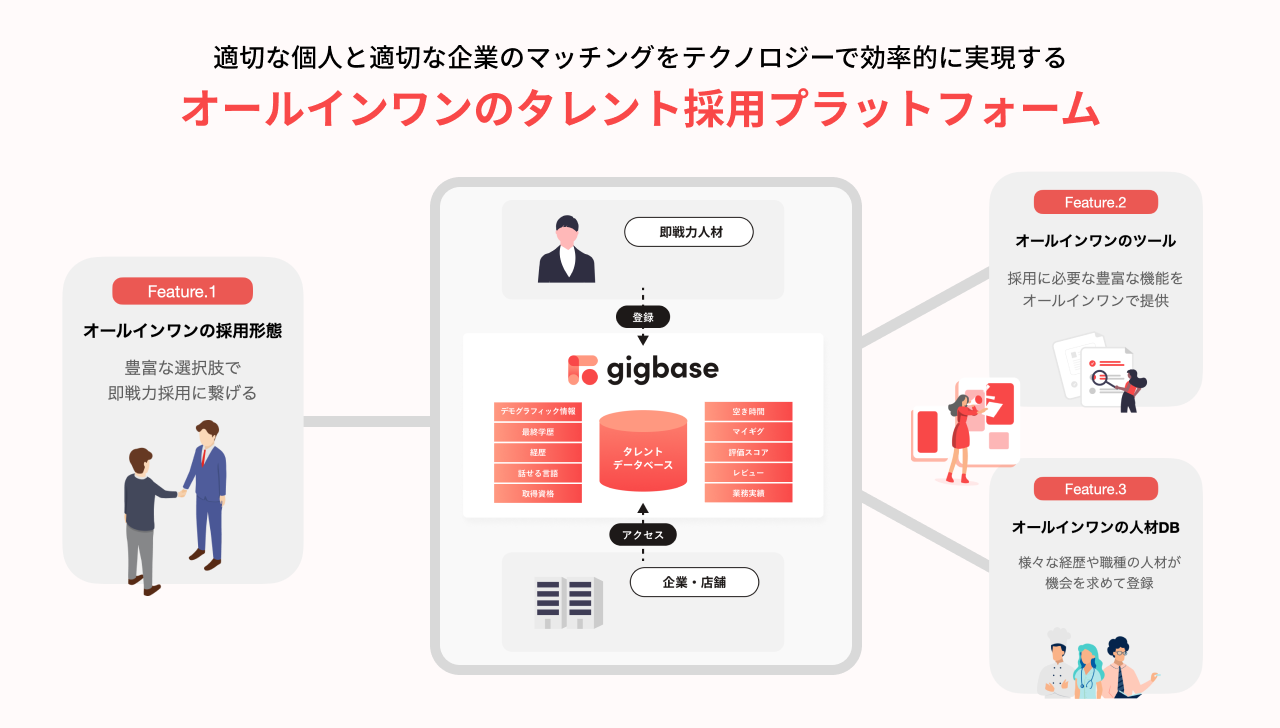 gigbaseは、適切な個人と適切な企業のマッチングをテクノロジーで効率的に実現するタレント採用プラットフォームとして、