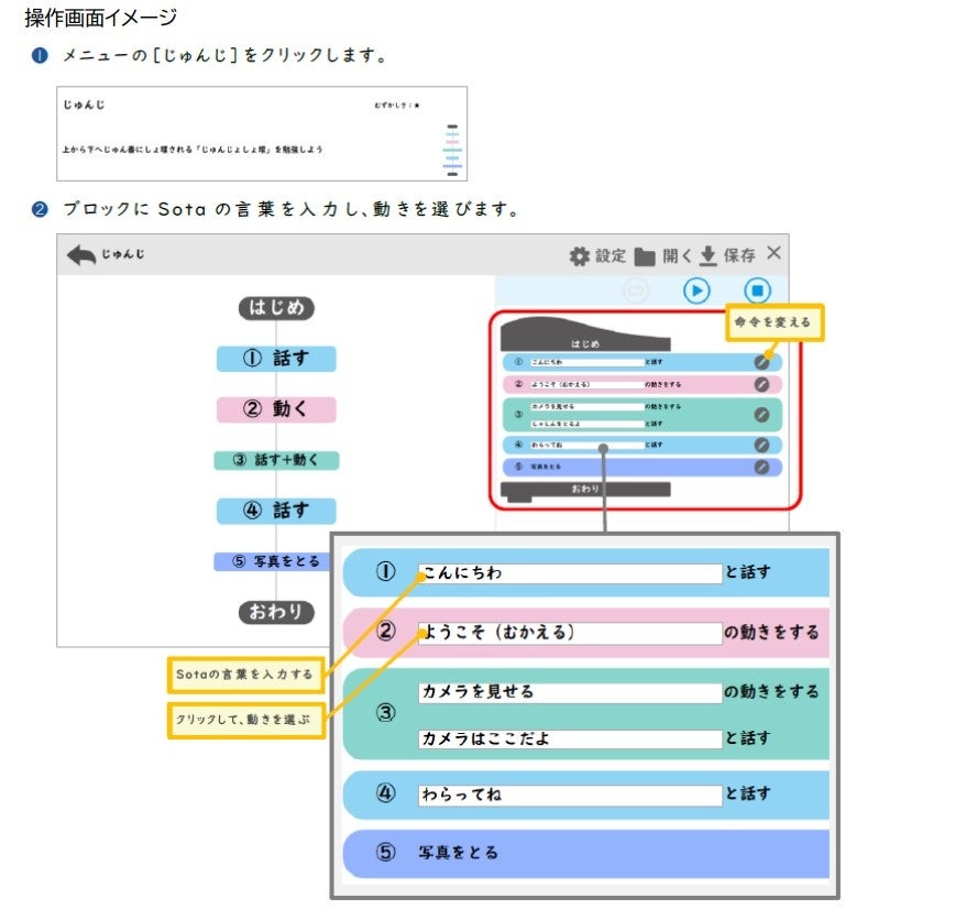Sota にしゃべらせることや動きなどを連動させて考えることでプログラミング的思考を学ぶことができます。