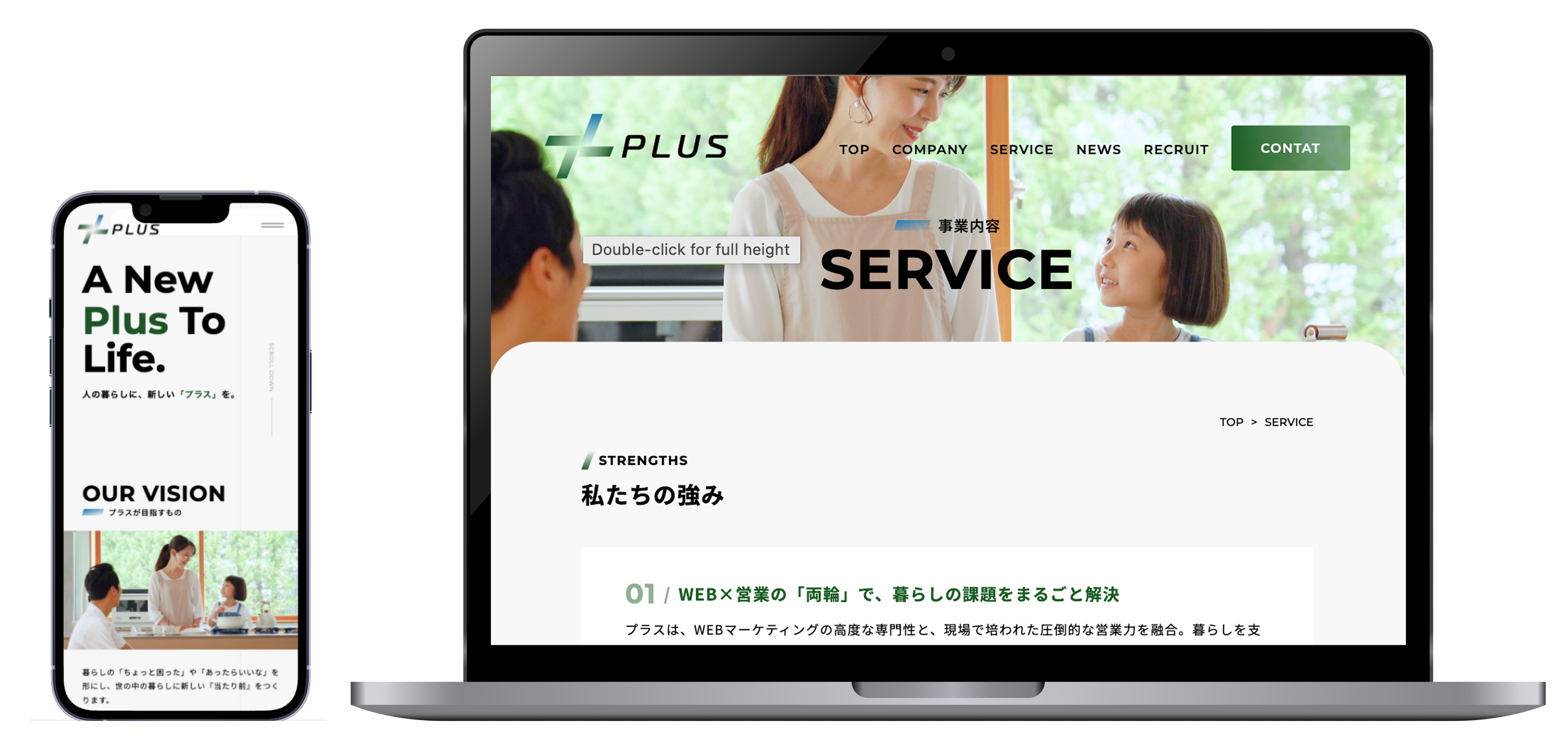 プラスは、「人の暮らしに、新しい『プラス』を。」というビジョンのもと、日々の“ちょっと困った”“あったらいいな”を形にし、新しい当たり前をつくることに取り組んでいます。現場で培った営業力とWEBマーケティングの専門性を融合し、UX改善や集客支援を通じて生活者・企業双方にメリットを生む“三方よし”の仕組みづくりを推進してきました。今回の新サイトは、そうした事業姿勢や提供価値をより直感的に理解いただける構成へ刷新したものです。