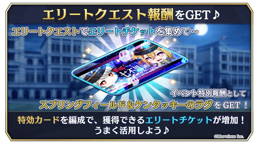 クエストで獲得できるイベントPt(ポイント)が増加したり、エリートクエストで効果を発揮する「イベント特効カード」で有利にイベントを進めましょう♪レアリティやカードによって発生する特効や特効の倍率が異なりますので、詳しくはゲーム内イベントクエスト画面内の「攻略のヒント」をご確認ください。