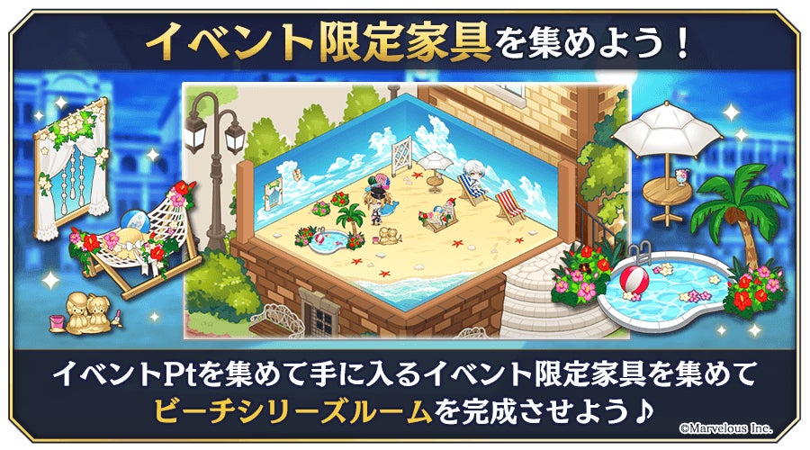 さらに今回のイベントではビーチシリーズの家具がイベントPt報酬で入手可能!限定家具のほかにも、「成長バッジ」や「手入れキット」などの育成アイテム、カードの覚醒に必要な「記憶の原石」、冠を作る素材など、さまざまな報酬が獲得できます。ぜひ逃さずゲットしてくださいね!