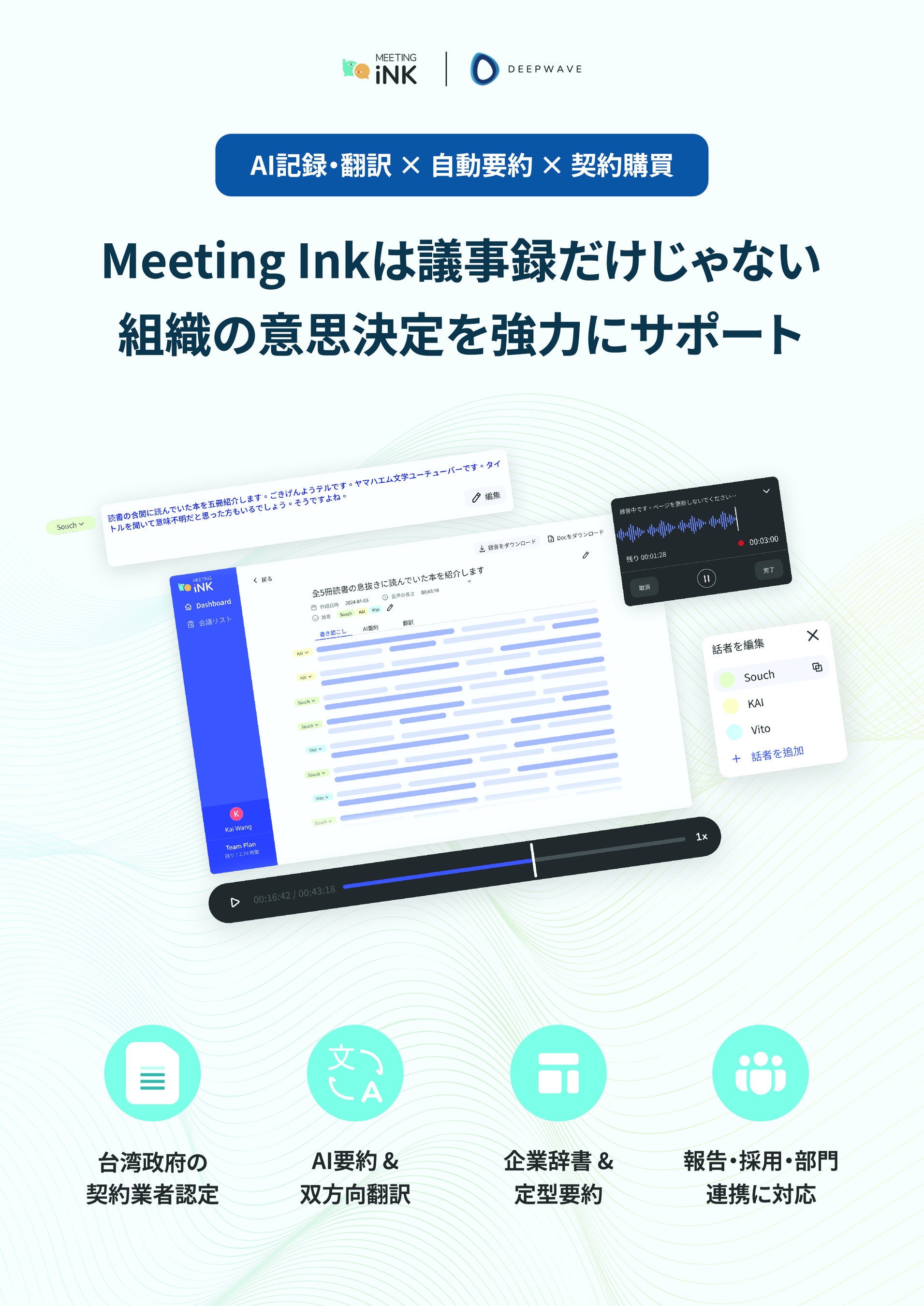 【台北・東京】台湾発のAI会議アシスタント「Meeting Ink」を開発・提供するDeepWave社は、GSE(Global Startup Ecosystem)やRamenTechなど日本の主要スタートアップイベントへの参加を経て、日本市場向けPOCを開始しました。同社は、会議を「知識」に変え、「行動」へとつなげるというミッションのもと、「会議(Before)→ 要約(During)→ アクション(After)」という構造を軸に、国際連携・協業の増加や高頻度化する会議記録ニーズといった日本企業特有の課題解決を目指します。