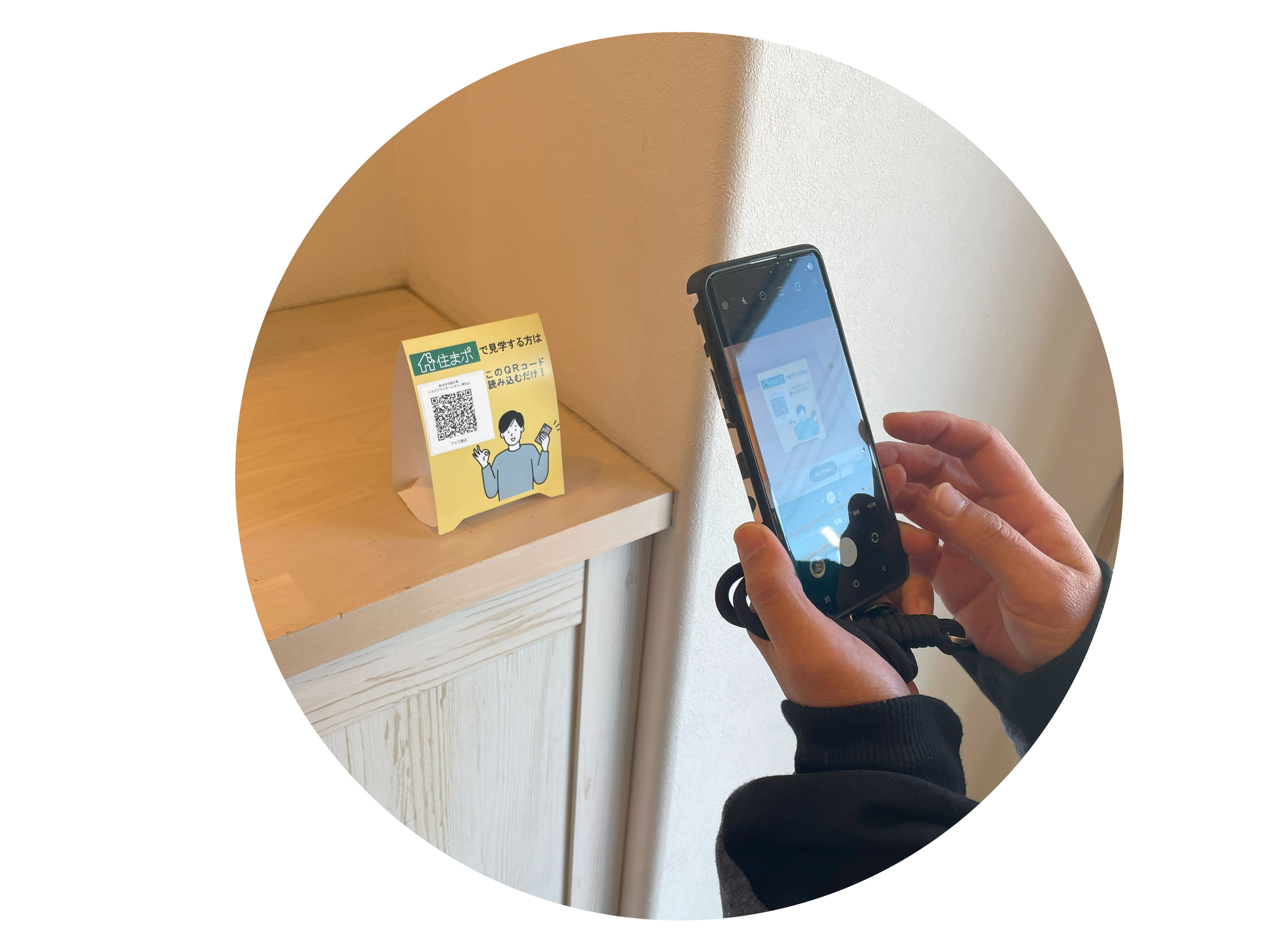 モデルハウス見学アプリ「住まポ」は、各モデルハウスに設置したQRコードを読み込むだけで、すぐ見学開始。モデルハウスに入るたびに面倒なアンケートや個人情報を記入する必要はありません。「住まポ」は見学の段階ではモデルハウスへ個人情報の開示は行いませんので、気軽に多くのモデルハウスを見学いただけます。そして気に入ったモデルハウスへの資料請求や問い合わせも簡単。アプリの資料請求画面からモデルハウスを選ぶだけ。この時に初めて対象のモデルハウスのみに個人情報が公開されますので、不特定多数の住宅会社からセールスされるという事がありません。さらに、見学したモデルハウスの新しい分譲地の情報やお得なキャンペーンなどの情報はアプリのお知らせに届きます。わざわざいろいろなサイトを探さずとも最新の情報を取得できます。