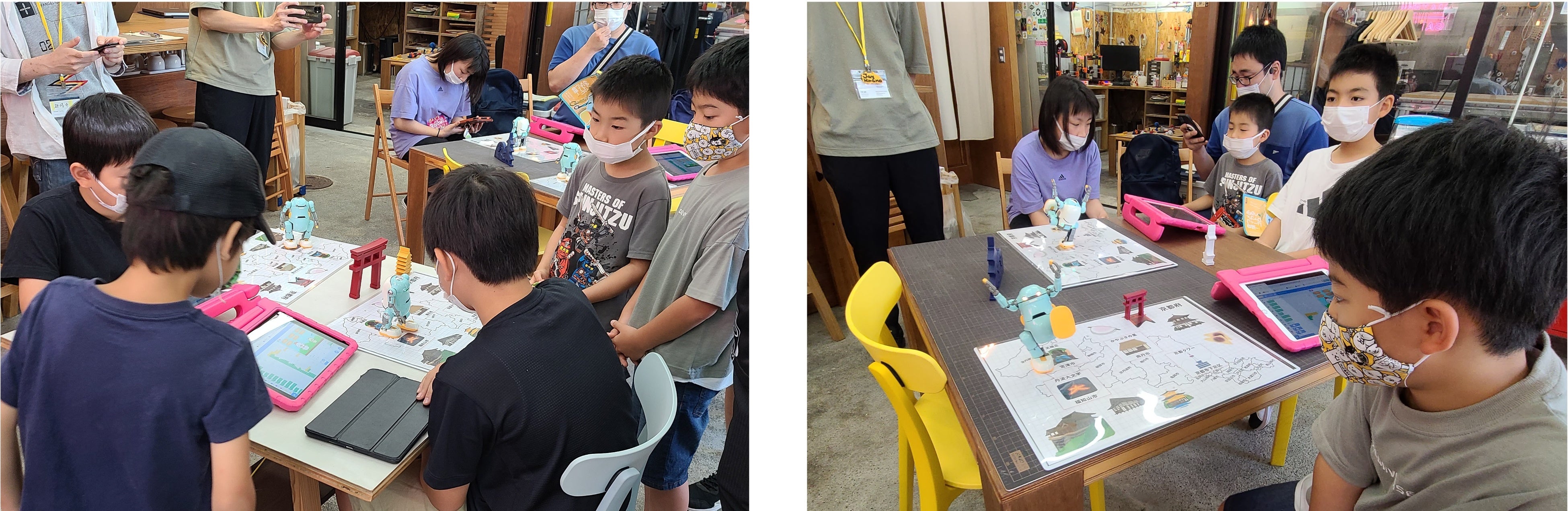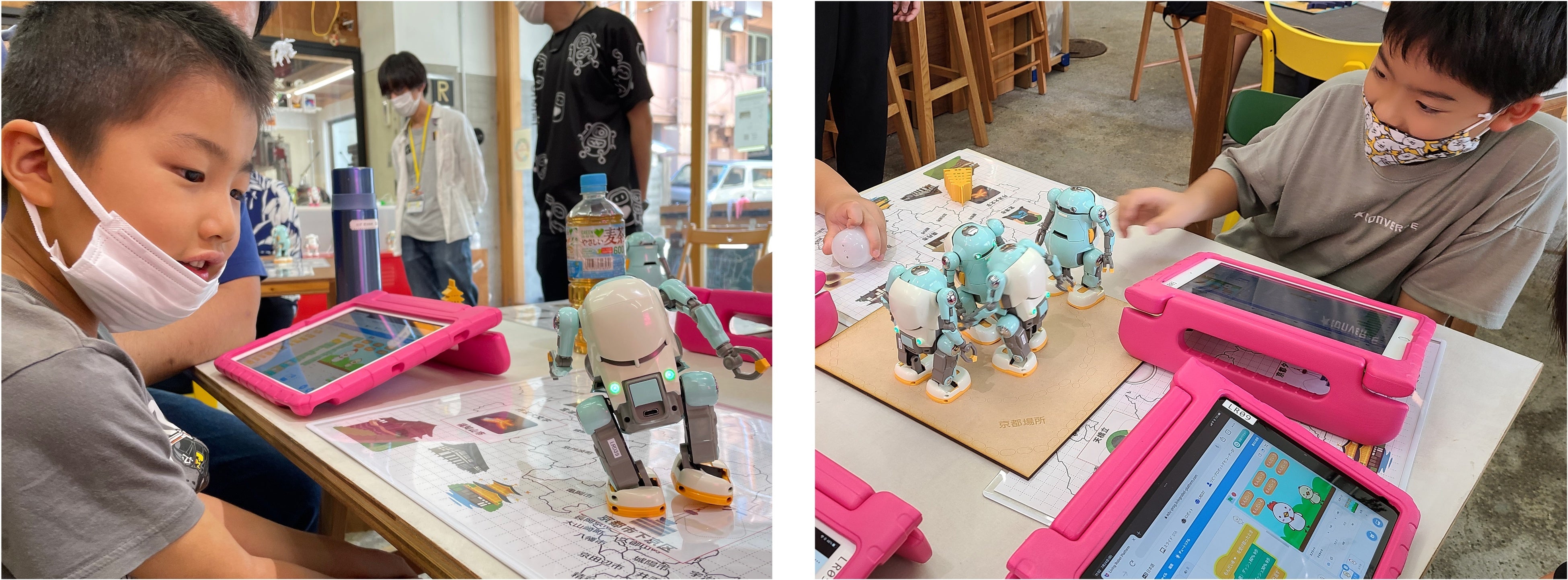 お子さんたちは、京都市のMAPを使ってロボットを一周させてみたり、ロボット同士を土俵の上で相撲対戦させたりするなかで、夢中になってプログラミングを楽しんでいるようでした。