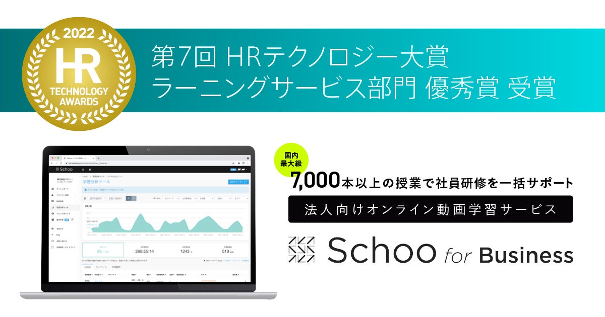 「今学びたい学習コンテンツに出会える」をコアバリューとし、社会人向け学習動画を約7,000本提供。ビジネスマナーやスキル、営業・プログラミング・デザインの実務スキルについてオンライン動画にて持続的な学習環境を提供することで導入企業は累計2,500社を突破。学習動画を元にした研修カリキュラムの提供やレポート提出、利用者の学習時間・学習傾向から興味のある分野を分析可能。オンライン集合学習機能も搭載。自発型学習による社員一人ひとりの潜在した可能性との出逢い、成長の機会の提供に役立てられている。オンライン学習サービス調査で4部門1位を獲得(http://corp.schoo.jp/2021/02/0218_press/)。