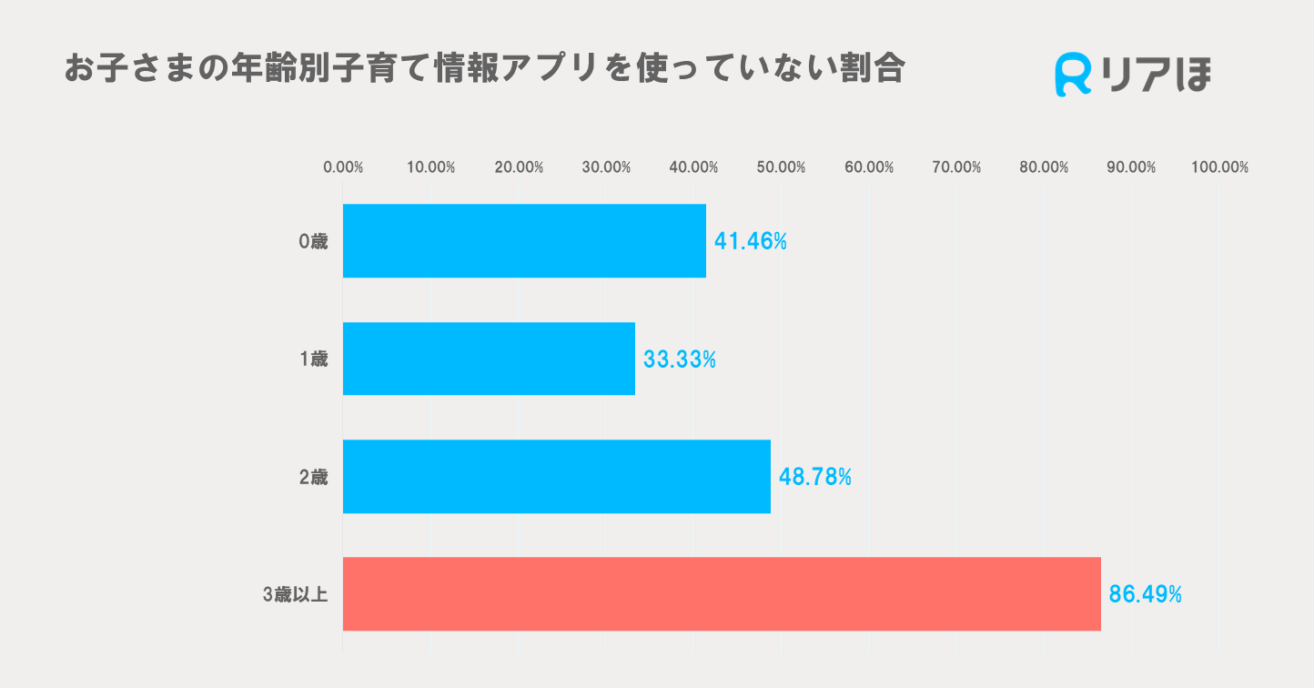 小さなお子さまがいるママさんを対象に、よく使っている子育て情報アプリを質問したところ、「使っていない」が過半数の57.33%となりましたが、以下のグラフにある通り、お子さまの年齢別で見ると3歳以上で86.49%となっており、0~2歳のお子さまをお持ちのママさんでは半数以下となりました。