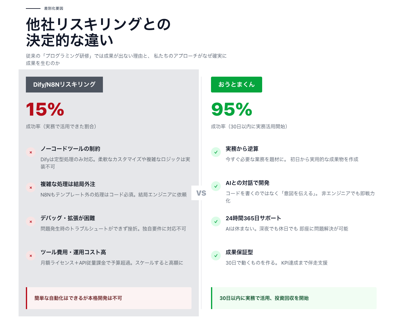 この潮流に対し、「おうとまくん」は“AIを使いこなす力”を短期間で習得し、企業の内製力を高めることを目的としています。