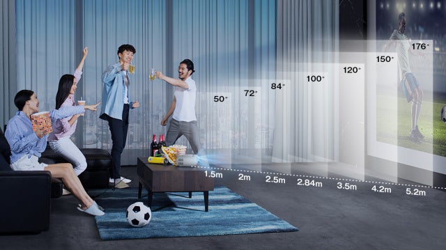コロナ禍で外出を控えるなど家で過ごす時間が増す中、誰にも気兼ねせず、大画面で映画やスポーツ観戦を楽しみたい!こんな方におすすめ!32インチから最大300インチの大きさで投写することができます。