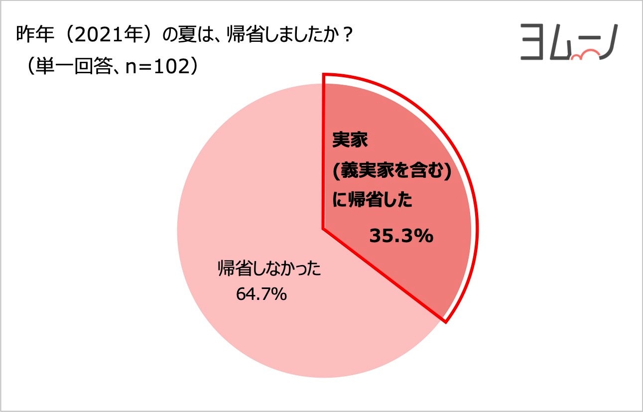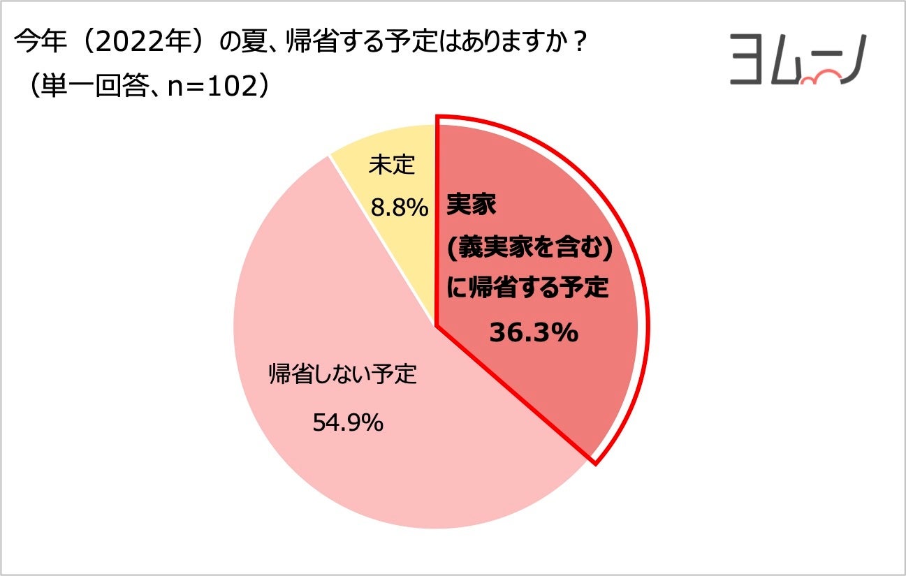 コロナ禍3年目となる今年の夏の帰省についてたずねたところ、「帰省する予定」との回答は36.3%で約4割に留まりました。昨年の帰省状況から大きな変化は無く、第7波の影響も鑑みて、引き続き帰省を控える傾向がうかがえます。