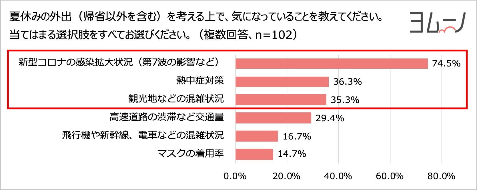 - 夏休みの外出を考える上で気になることは「新型コロナの感染拡大状況」「熱中症対策」「観光地などの混雑状況」