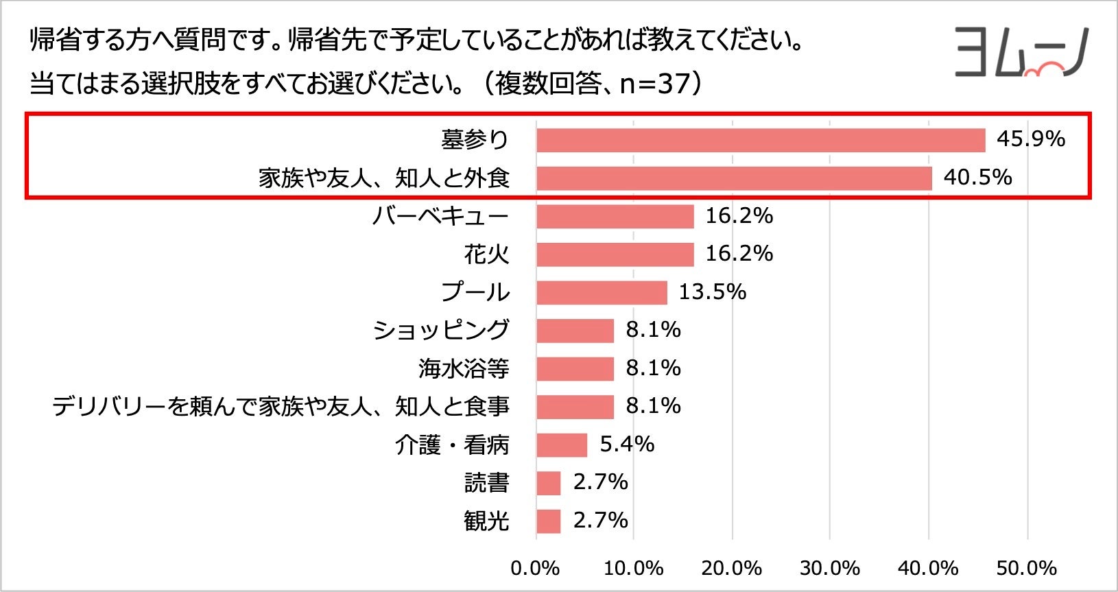 - 帰省先で予定していることは「墓参り」「家族や友人、知人と外食」が4割超