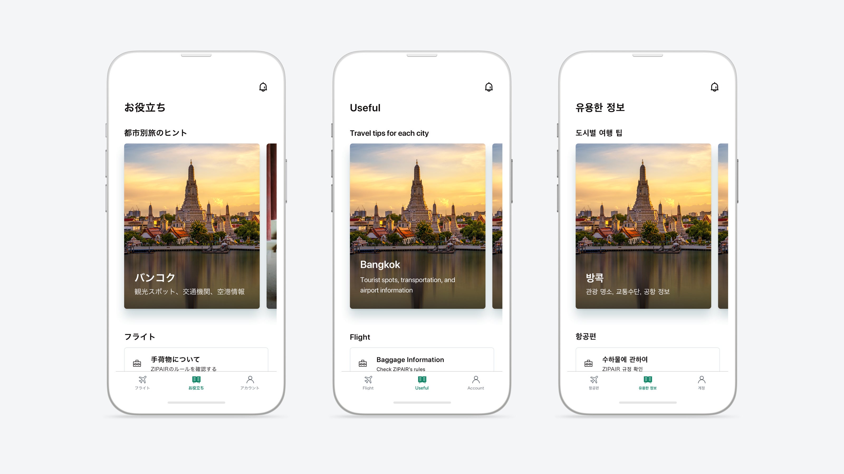 また旅先の観光スポットや移動手段などのお役立ち情報の閲覧、ZIPAIRポイントとJALマイルの交換も行え、旅行の準備に必要なことをこのアプリ一つで行えるよう設計しました。移動手段など、旅先で役に立つ情報はオフラインでも閲覧可能としています。