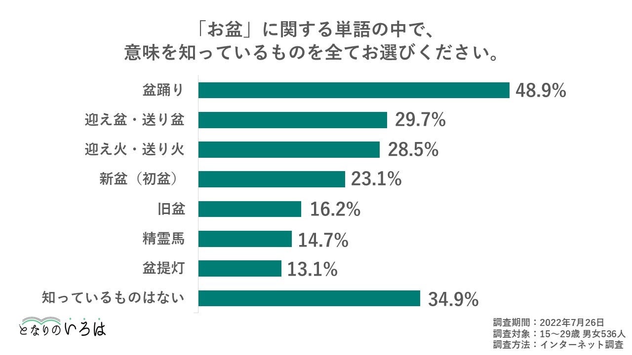 また「知っているものはない」と回答した人は約3人に1人(34.9%)にのぼっており、お盆に関する単語にあまり馴染みがない人も一定数いることが分かりました。
