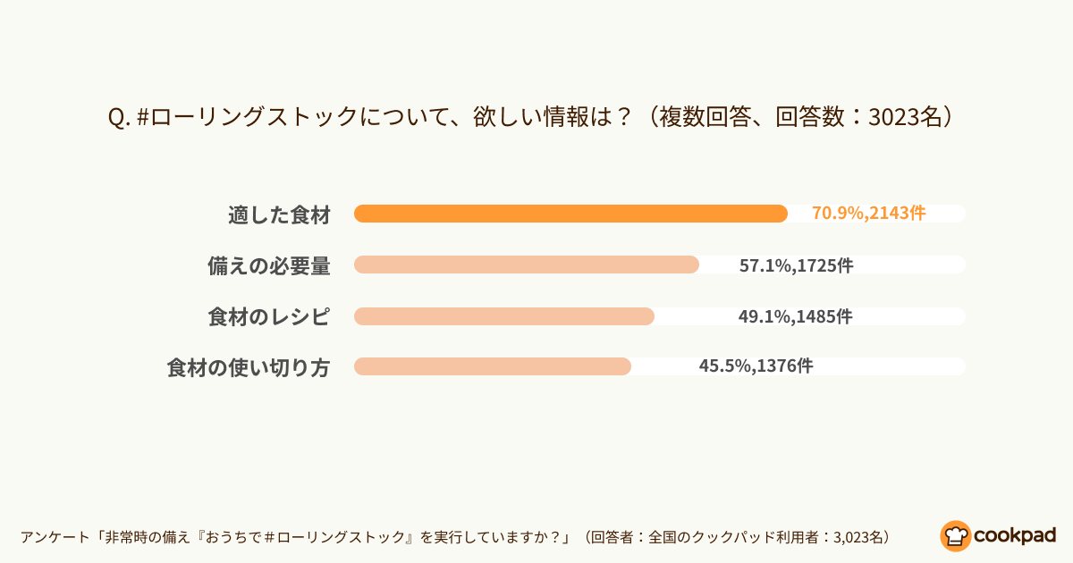 「適した食材」70.9%、「備えの必要量」57.1%、「食材のレシピ」49.1%、「食材の使い切り方」45.5%