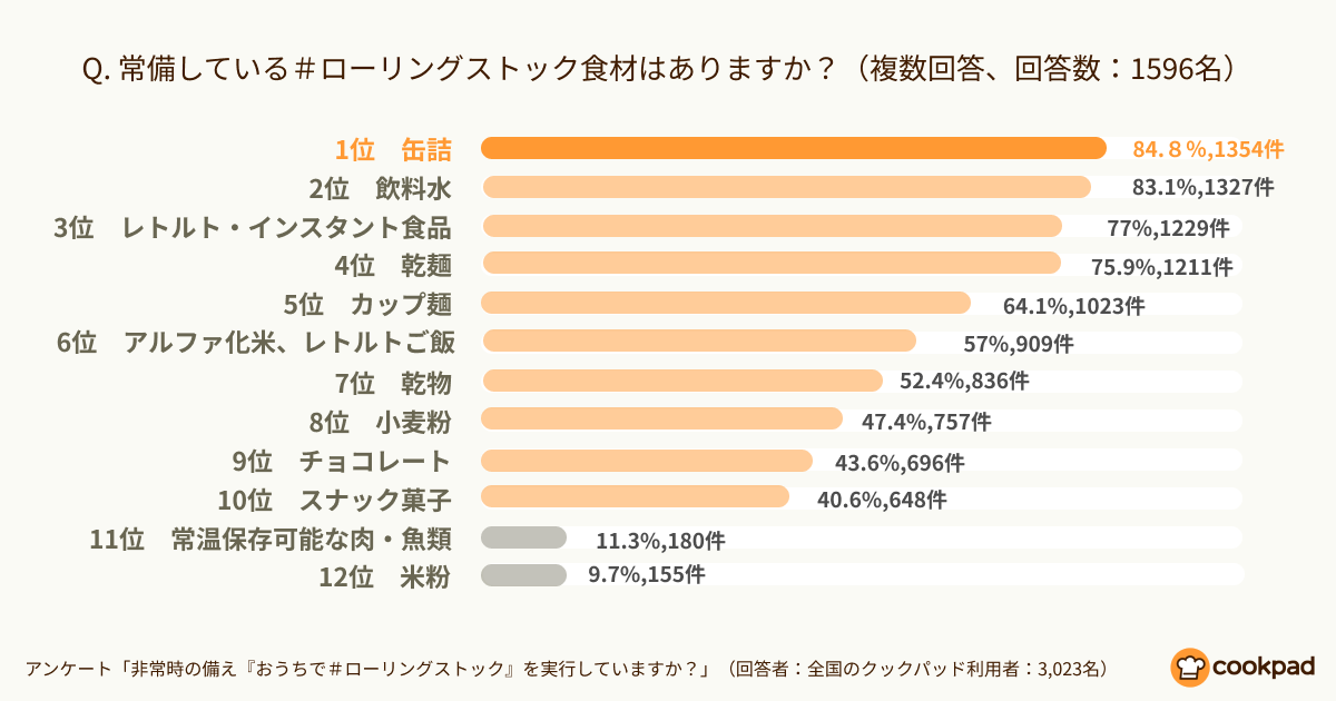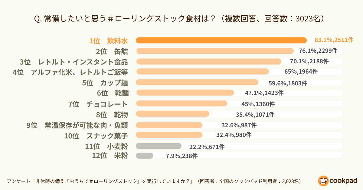 「飲料水」83.1%、「缶詰」76.1%、「レトルト・インスタント食品」70.1%、「ご飯(アルファ化米、レトルトご飯など)」65%、「カップ麺」59.6%、「乾麺」47.1%、「チョコレート」45%、「乾物」35.4%、「常温保存可能な肉・魚類」32.6%、「スナック菓子」32.4%、「小麦粉」22.2%、「米粉」7.9%
