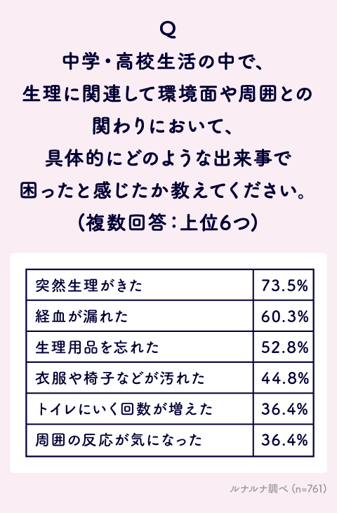 具体的には「突然生理がきた」73.5%が1位で、「経血が漏れた」60.3%がそれに続く結果となりました。自由回答では、「異性にからかわれた」という声のほか、「和式のトイレで使いづらかった」という意見も多数寄せられました。