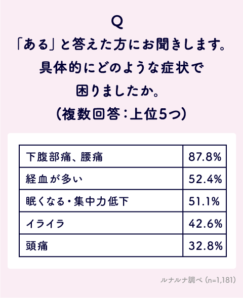 どのような症状で困ったかを聞いてみると、1位は「下腹部痛、腰痛」87.8%となり、困った症状があると回答した人の9割近くが生理痛を抱えていることが分かります。