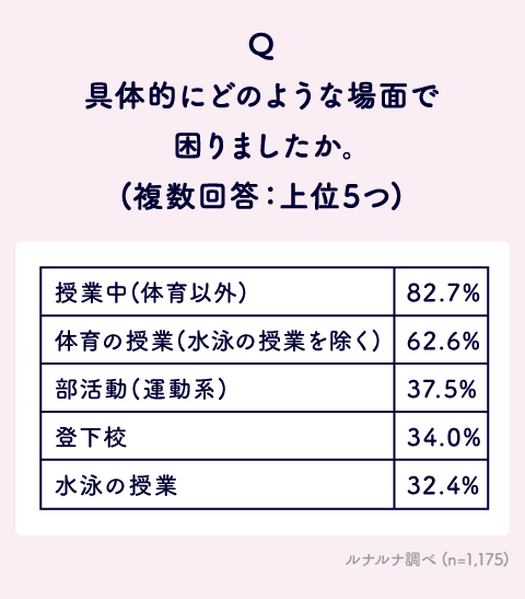 また、「体育の授業(水泳の授業を除く)」62.6%、「部活動(運動系)」37.5%とカラダを動かすシーンも上位に挙げられました。一方で、意外にも「登下校」34.0%を挙げる声も多く、生理期間中は1日中悩みが絶えないようです。
