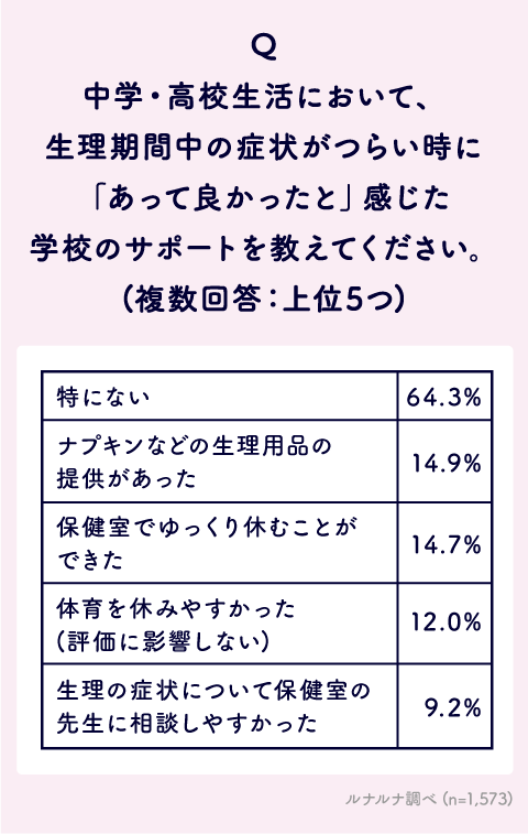 一方で、「ナプキンなどの生理用品の提供があった」14.9%、「保健室でゆっくり休むことができた」14.7%など、学校によっては生理に関するサポートがあったという声もありました。
