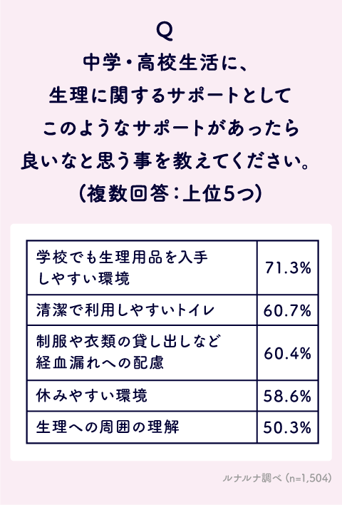そのほか「清潔で利用しやすいトイレ」60.7%、「制服や衣類の貸し出しなど経血漏れへの配慮」60.4%なども上位に挙がりました。