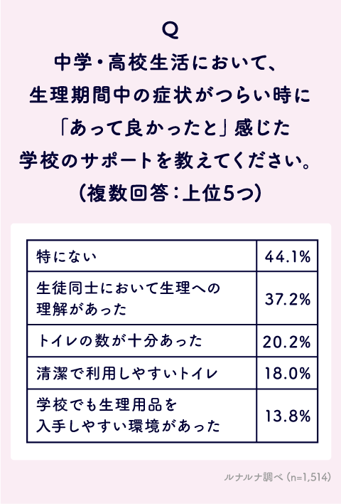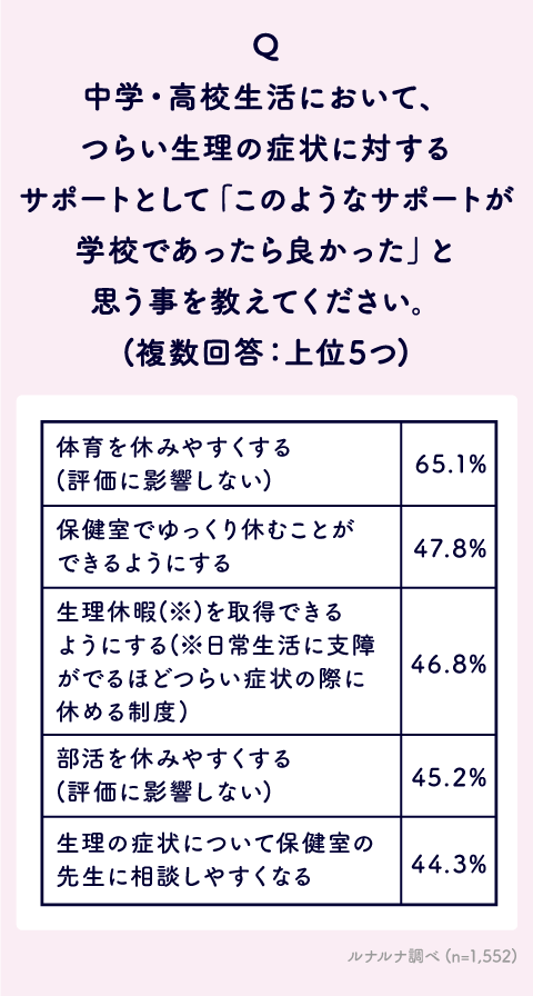 Q. 中学・高校生活において、生理期間中の症状がつらい時に「あって良かった」と感じた学校のサポートを教えてください。(複数回答:上位5つ)