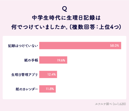 まずは中学生時代の生理日記録の手段を聞いてみると、全年代を通しての1位は「記録はつけていない」58.0%で、記録していない人が多数派であることが分かります。