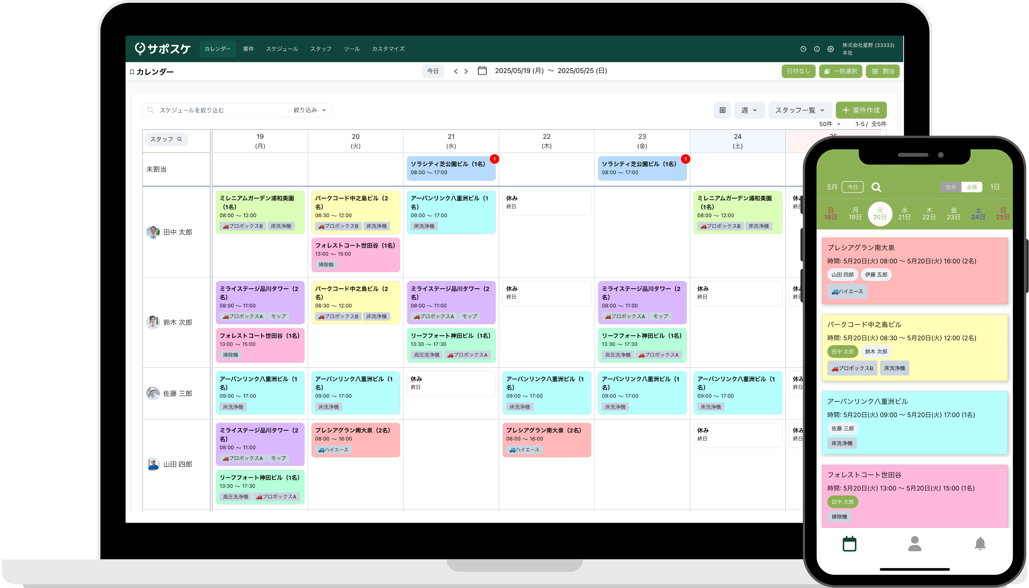 サポスケは管理者がスタッフの予定を決めている企業を中心に、専門工事・ビルメンテナンス・訪問看護/介護・イベント運営・人材派遣・警備など幅広い業種で導入されている現場向けのスケジュール管理クラウドです。管理者がスタッフの予定を組む際に、従来Excelやホワイトボードで行われていた煩雑なスケジュール管理・共有を、シンプルな操作で効率化します。スケジュールを最適に運用することで、限られた人員でより多くの業務をこなせるようになり、業務効率化と売上向上を同時に実現。導入企業は270社を超え、現場で働く人々の生産性向上と働き方の改善を支援しています。
