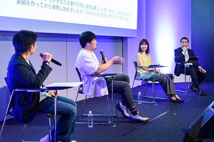トークセッションのテーマは、「大企業は社会課題解決に合理性を見出せるのか」。当社社員は、実際に社会課題解決に挑戦する大企業の担当者として登壇し、新規事業開発の困難や社内での合意形成の壁などについて、3名の起業家と体験談を共有し合いました。