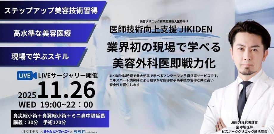 株式会社B4A(代表取締役CEO:植松 正太郎)が開発・販売する自由診療クリニック特化型のDXツール『B4A(ビーフォーエー)』は、JIKIDENプロジェクト(事務局長・医師:室 孝明)、株式会社SSF(代表取締役社長:佐々木 威人)と共同で、ドクター向けの定期講習会を実施するプロジェクトを立ち上げます。