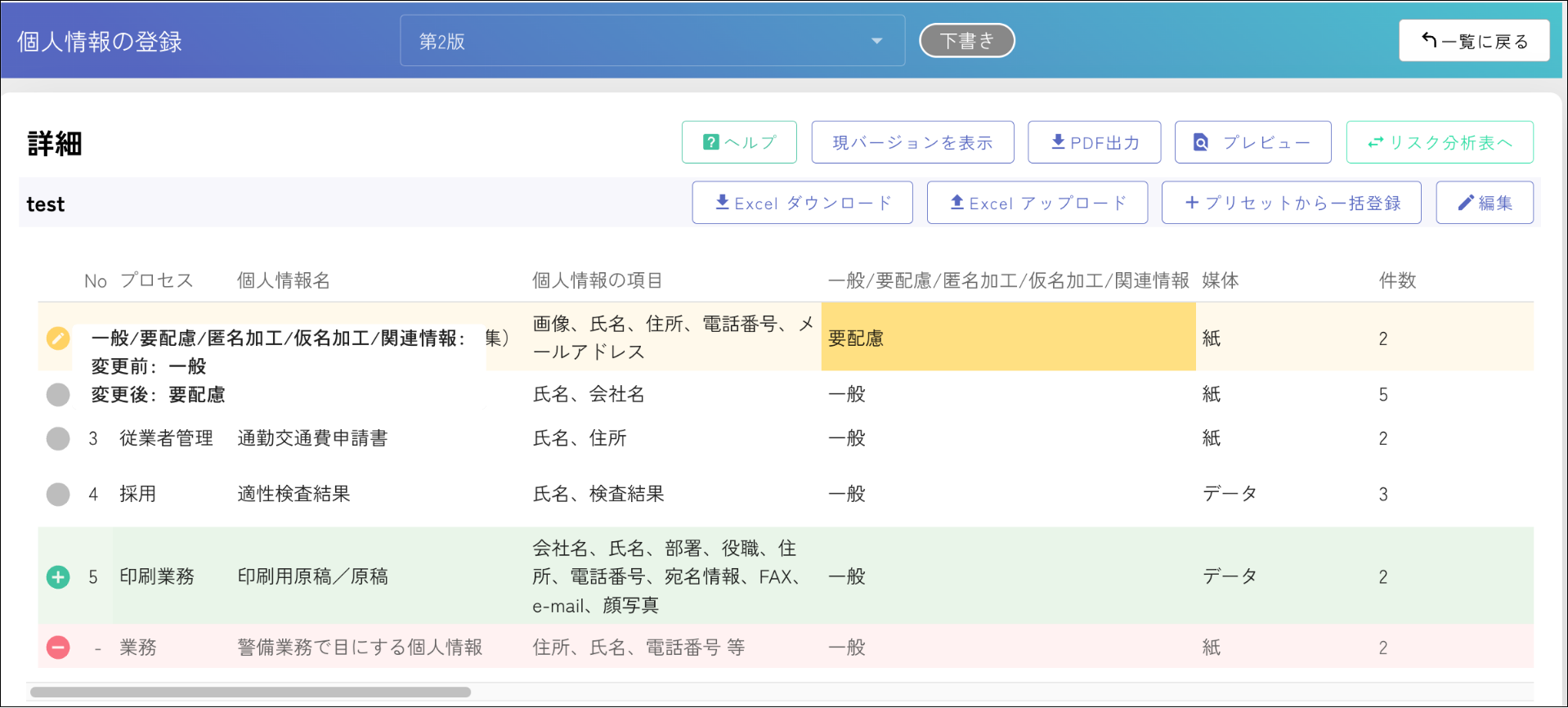 今回のアップデートでは、「個人情報保護管理台帳」機能に、前年版と現行版の差分(変更履歴)を自動的に比較・表示できる機能を追加しました。これにより、利用者は膨大な台帳の中から変更箇所を探す手間を省き、更新漏れを防ぎながら効率的に最新状態を維持できます。また、審査時にも変更点を容易かつ迅速に提示できるため、準備作業の負担を大幅に軽減します。