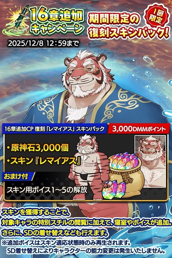 16章追加を記念して章更新限定キャラクター、パラレルIF限定キャラクターがそれぞれセレクトSTEPUPガチャで登場する「16章追加CP 章更新限定入りセレクトSSR確定STEPUPガチャ」、「16章追加CP パラレルIF限定セレクトSSR確定STEPUPガチャ」や、「レマイアス」スキンを獲得できるバックを復刻した「16章追加CP 復刻「レマイアス」スキンパック」、また、1回購入限定の「16章追加キャンペーン」スペシャルパックが2種期間限定で登場!この機会をお見逃しなく!