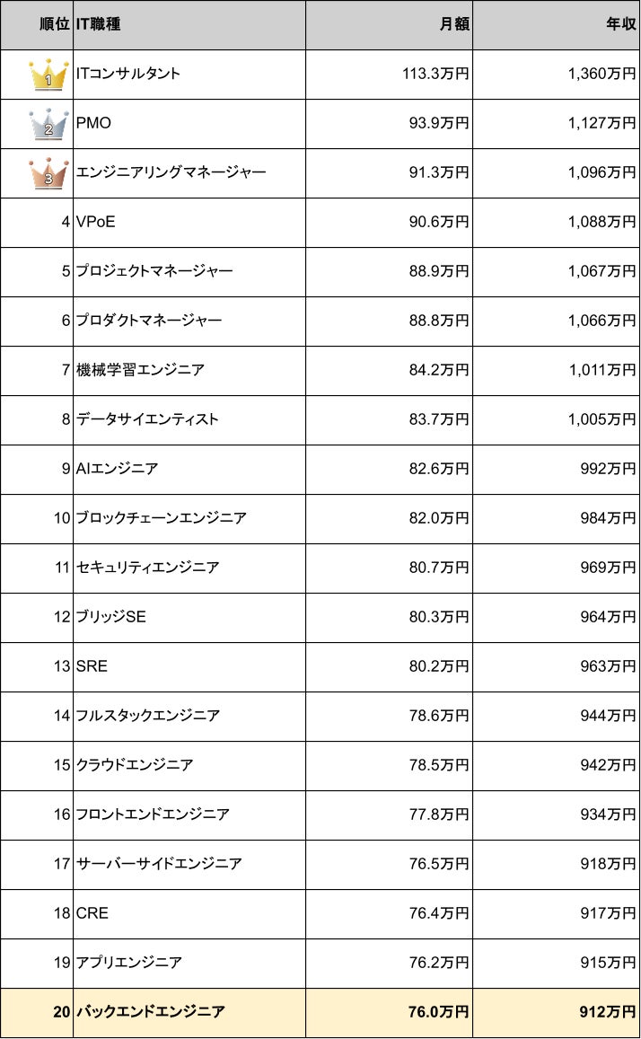 バックエンドエンジニア案件の平均月額単価は76.0万円、平均年収は912万円で、IT職種別の年収ランキングでは20位に位置しています。サーバー側の処理やデータベース設計を担う職種の中でも、安定した単価水準を維持している職種といえるでしょう。