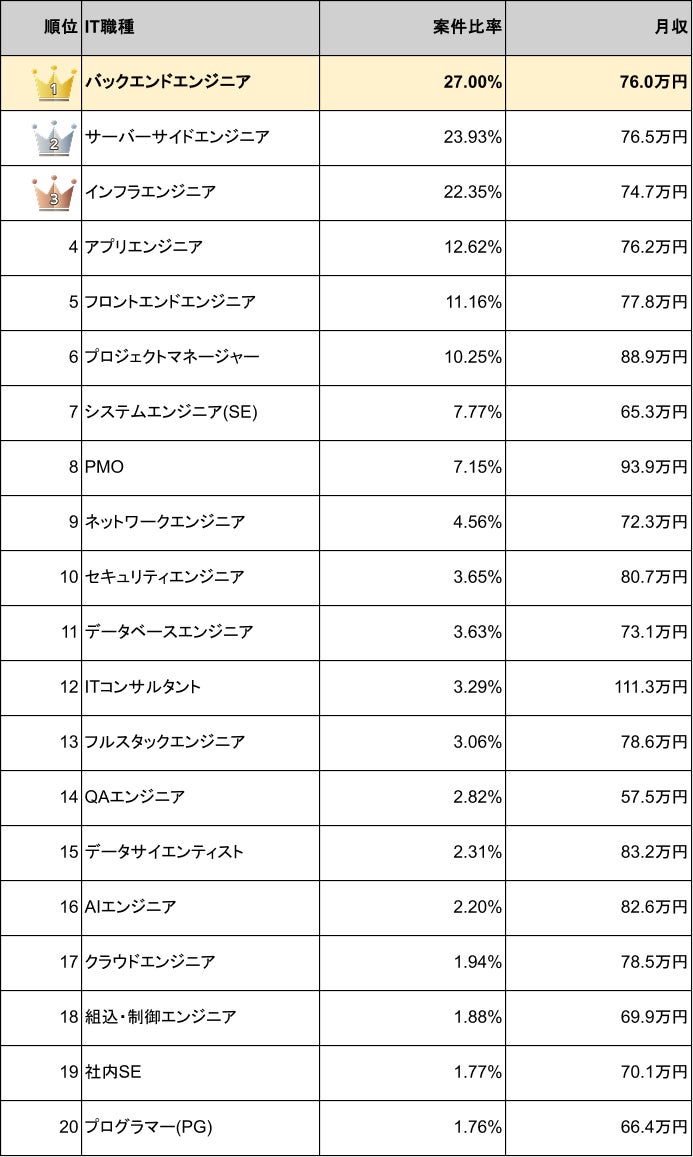 2025年11月時点でバックエンドエンジニアの案件は市場全体の27.0%を占め、IT職種別の案件数ランキングで1位となっています。平均月額単価は76.0万円と高水準で安定している状況です。