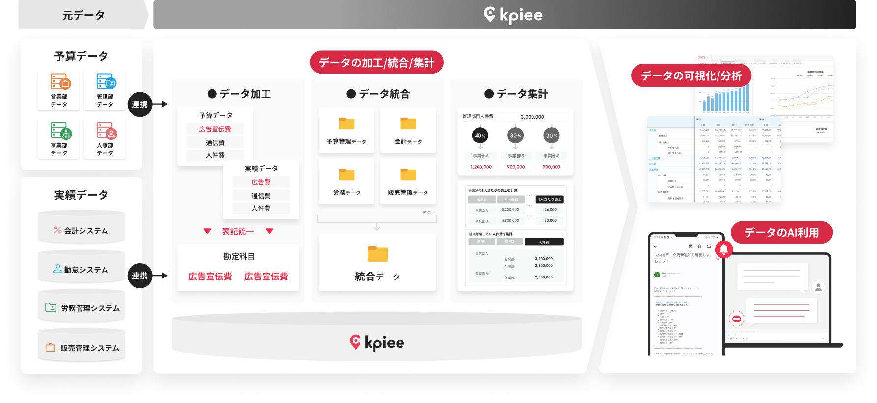 「kpiee」は、経営管理部が抱える、予算策定から経営判断までにおける悩みをまるっと解決し、戦略策定のための時間を創出し、経営の意思決定を実現するクラウドサービスです。複数ツールに散在するデータの集計/分析/可視化を自動化することにより、迅速かつ精度の高い経営判断が可能になります。また生成AIを搭載しており、予実のズレや異常値を自動で通知してくれるほか、気になる数値に対する質問もAIが回答してくれるため、データ活用を促進し経営のクオリティを向上させることができます。