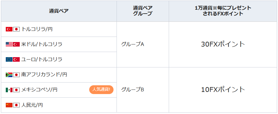 対象通貨ペアそれぞれの取引数量に応じて、外為どっとコムオリジナル「FXポイント」をプレゼントするキャンペーンとなります。この機会にぜひ、外為どっとコムでFX取引をはじめてみてはいかがでしょうか。