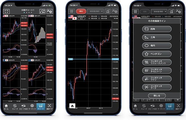 1つの画面で本番口座とデモ口座の切り替えが可能なので、慣れていない通貨ペアへのチャレンジやお取引の練習に使えるはじめてのFXに最適なアプリです。