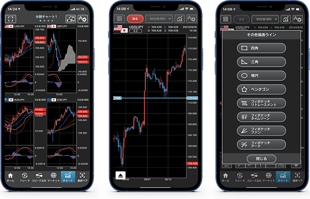 22種類ものテクニカル、12種類ものライン描画機能を用意していますので、お客様のニーズに合わせた分析が可能です。