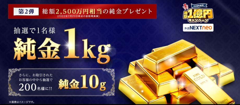 対象期間中にエントリーされ、『外貨ネクストネオ』で50万通貨(500Lot)以上の新規注文のお取引をされたお客様の中から抽選で200名様に「純金10g」(84,270円相当※)をプレゼントいたします。さらに取引数量によって当選確率が上昇し最大20倍になります!