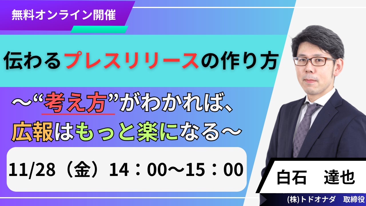 株式会社トドオナダ(東京都台東区、代表取締役:松本泰行、以下トドオナダ)は、広報担当者がこれからの時代に必要とされる「〜“考え方”がわかれば、広報はもっと楽になる〜」をテーマにしたオンラインセミナー『伝わるプレスリリースの作り方』を、2025年11月28日(金)に開催します。