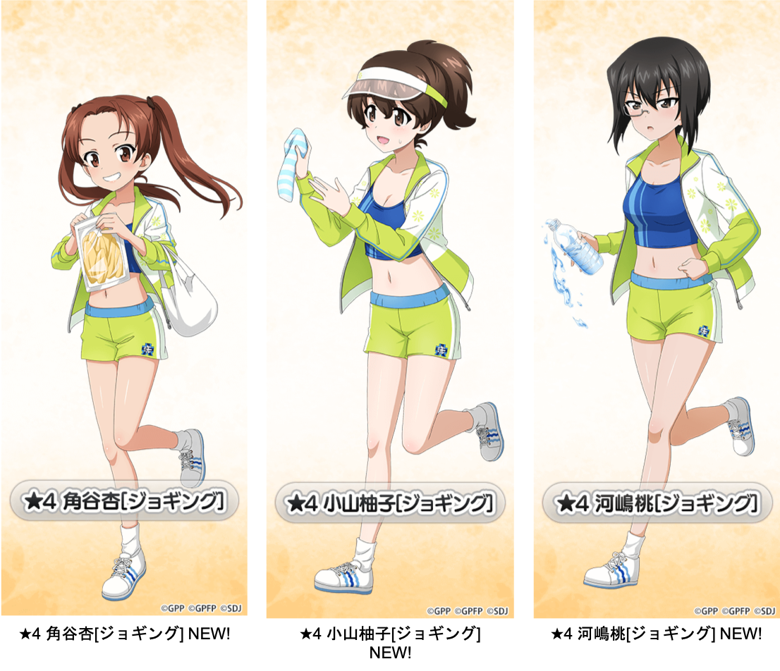 8月2日(火)13時から開始する8月日替わりイベントでは、ジョギング衣装の角谷杏、小山柚子、河嶋桃が新生徒として登場いたします。ぜひご確認ください。