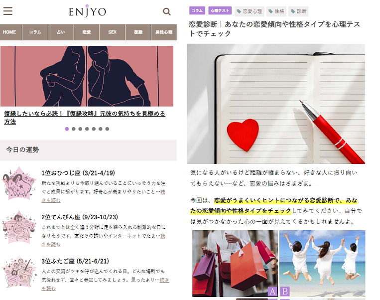 『ENJYO(エンジョー)』は、炎えるように恋をして、艶やかに生きる女性のための恋愛コラム&無料占い配信メディアです。女性向けのディープな恋愛やナイトライフまで…様々なテーマを取り揃えた読みごたえたっぷりの恋愛コラムと、TVや書籍、雑誌など各メディアで活躍する人気占い師による無料占いを毎日更新!