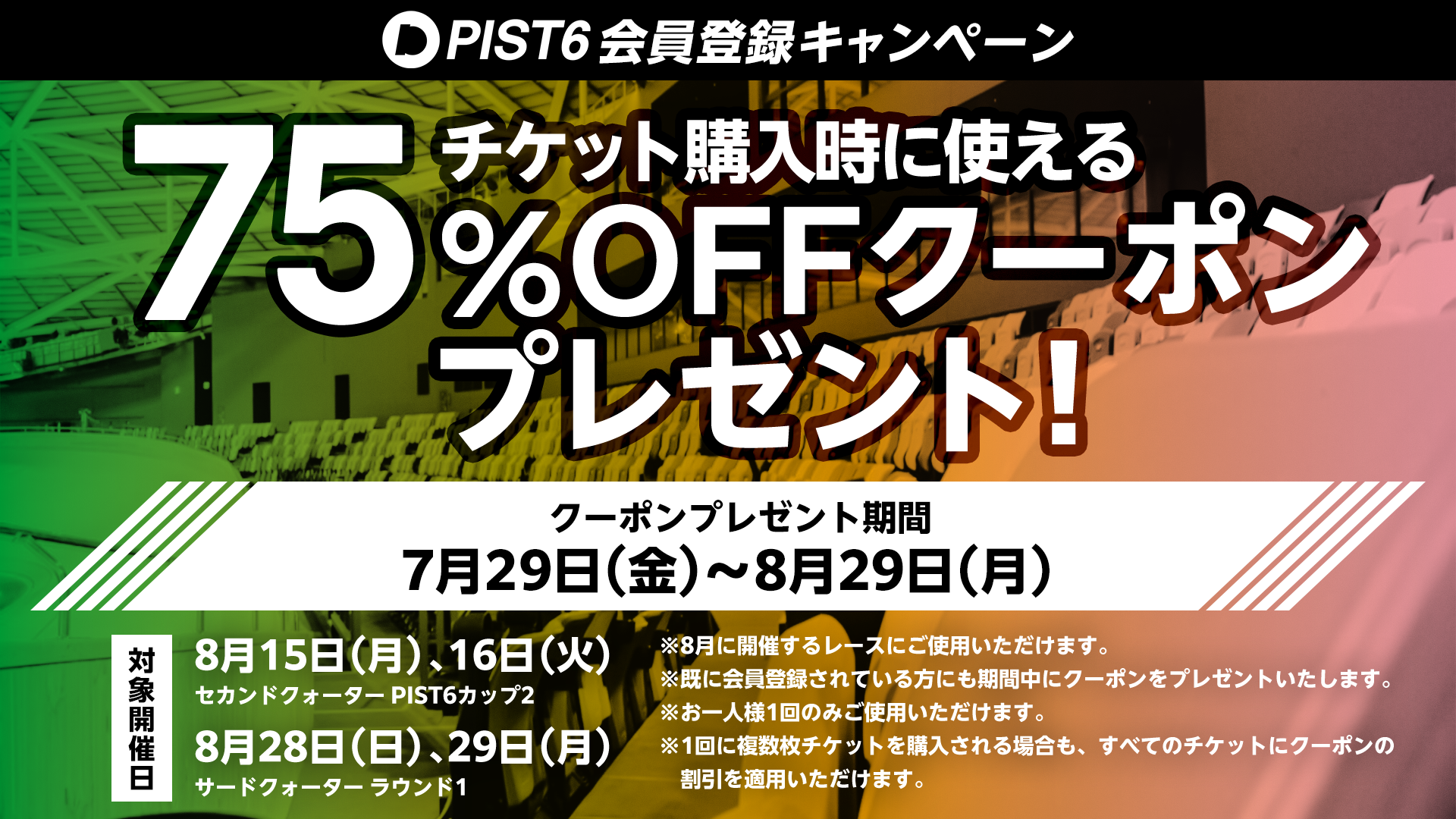 PIST6会員を対象に、対象レースのチケット購入時に使用できる「チケット75%OFFクーポン」をプレゼント!新規にご登録いただいた方、既存会員の方ともにクーポンをプレゼントいたします。