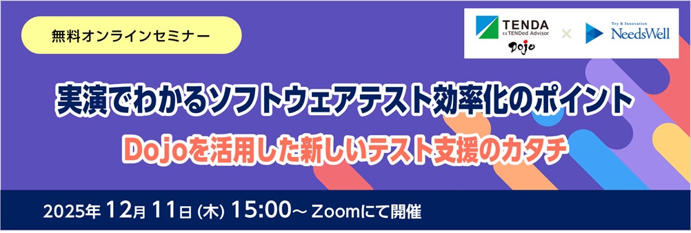 株式会社ニーズウェル(本社:東京都千代田区、代表取締役社長 松岡 元)は、2025年12月11日(木)15時より、無料オンラインセミナー「実演でわかるソフトウェアテスト効率化のポイント ~Dojoを活用した新しいテスト支援のカタチ~」を開催します。
