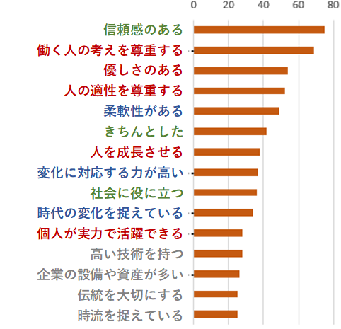 ※「入社したい魅力を表す企業のイメージ」の選択順位で上位に来たものを要素解析し、緑色は社会的信頼感、赤色は人の尊重、青色は時代の変化への柔軟性として上位10個を分類しました。